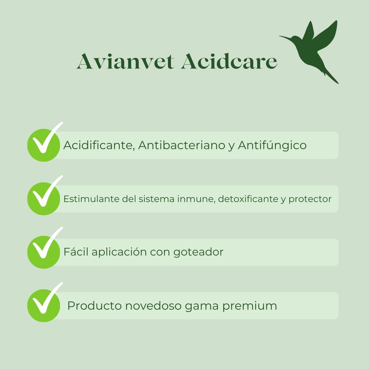 Acidcare Avianvet 100ml es un suplemento líquido para aves que favorece la salud intestinal y mejora la digestión. Su fórmula ácida contribuye a equilibrar el pH gástrico, ayudando a prevenir infecciones y favoreciendo la absorción de nutrientes esenciales.