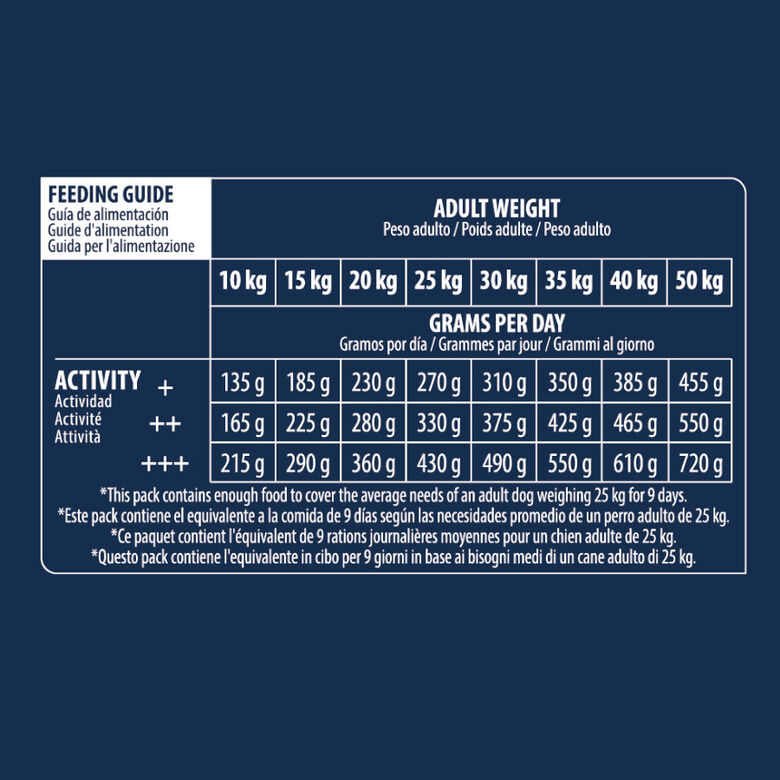 | Peso adulto | Gramos por día actvidad baja | Gramos por día actividad media | Gramos por día actividad alta |