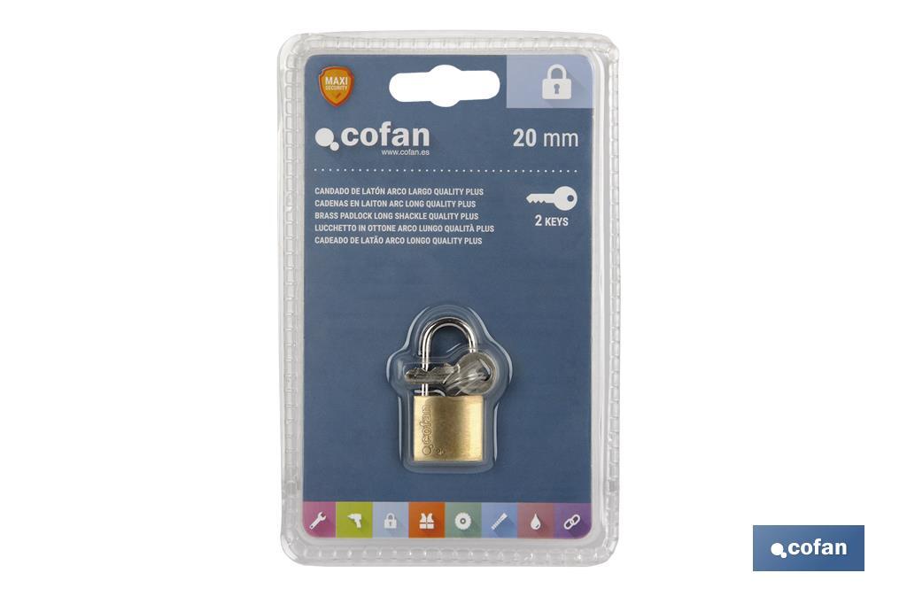 El Candado de Latón Arco Largo Quality Plus de Cofán es un candado resistente y duradero, ideal para asegurar puertas, portones y otras cerraduras. Con un diseño de arco largo y materiales de alta calidad, proporciona una mayor seguridad y protección.