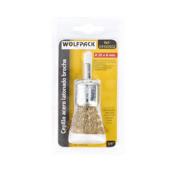 Cepillos de acero latonados WOLFPACK, ideales para limpieza, desbarbado y acabado de superficies metálicas con gran durabilidad.