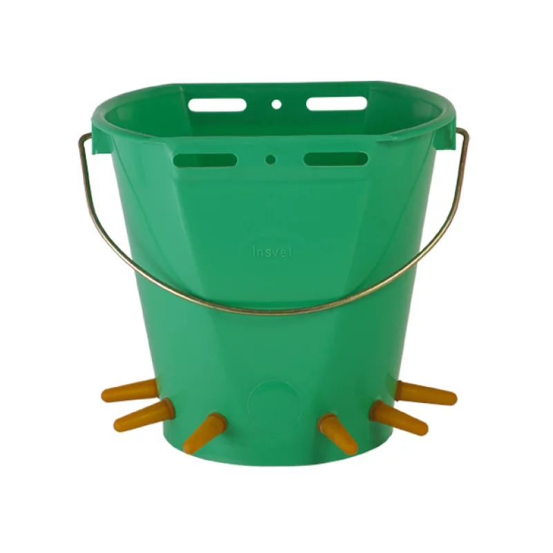 Fabricado en materiales resistentes y duraderos, este cubo es fácil de usar y de limpiar, lo que garantiza una alimentación higiénica y segura para los animales. Las tetinas de salida están diseñadas para ofrecer un flujo adecuado de leche, permitiendo que los corderos puedan alimentarse de manera cómoda y natural.