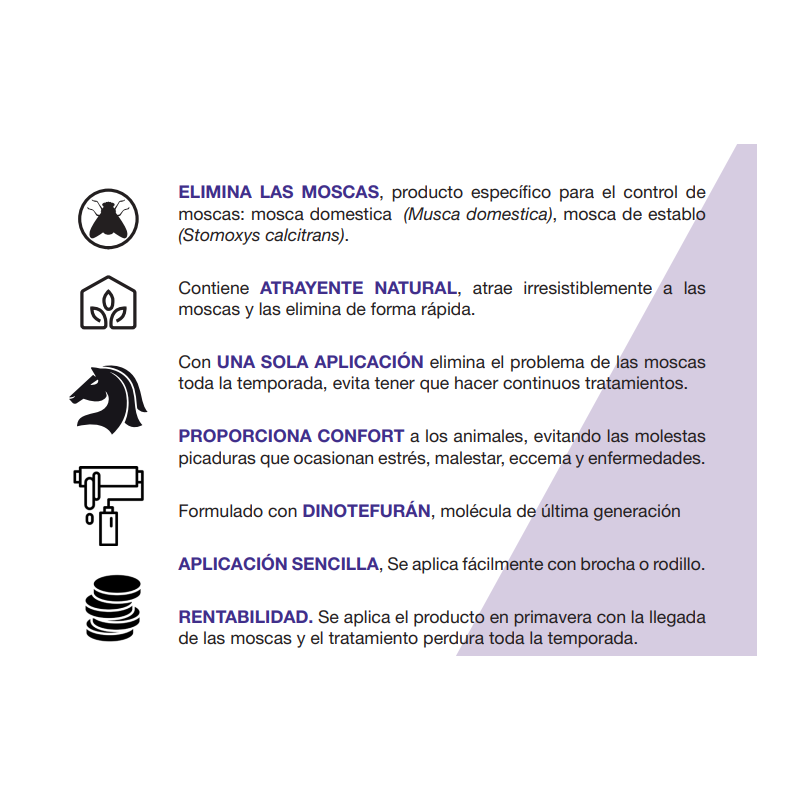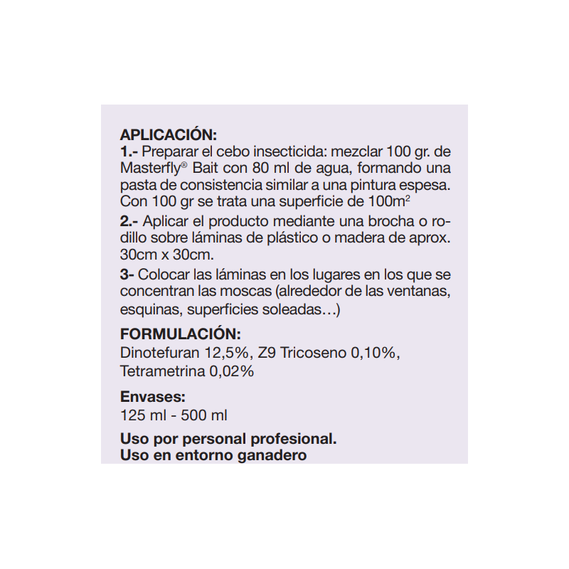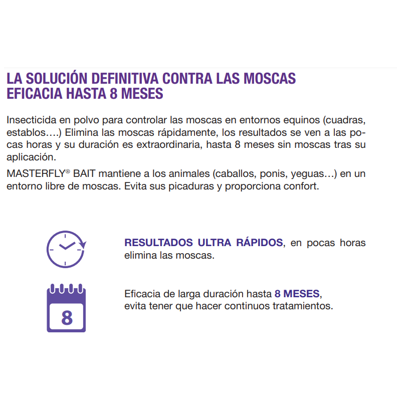 Gracias a su acción rápida y su efecto residual, el Diptron Mastrfly Bait no solo elimina las moscas presentes, sino que también previene nuevas infestaciones, contribuyendo a mantener un entorno limpio y saludable.