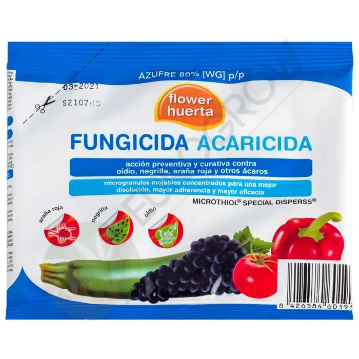 El Fungicida Acaricida Azufre 80% (50g) es un tratamiento eficaz contra hongos y ácaros en cultivos y plantas ornamentales. Su alto contenido en azufre micronizado ofrece una acción preventiva y curativa frente a oidio, araña roja y otras plagas, asegurando una protección duradera y natural.