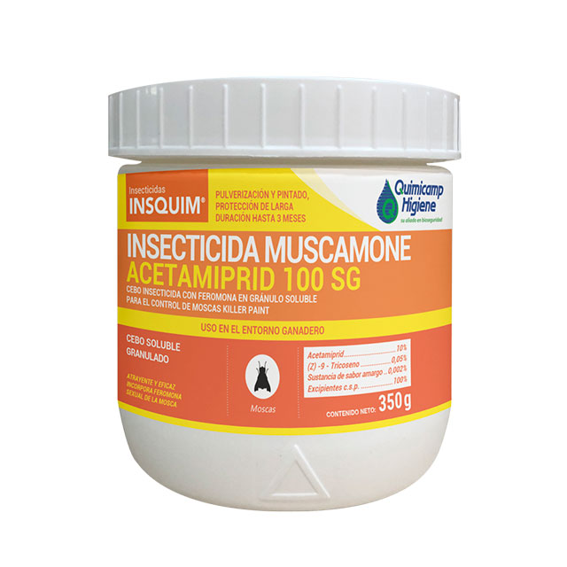 INSECTICIDA MUSCAMONE ACETAMIPRID 100 SG es un cebo granulado soluble, formulado a base de acetamiprid, insecticida neonicotinoide de nueva generación. Gracias a la incorporación de un atrayente sexual (muscamone) y a la presencia de atrayentes alimenticios las moscas son atraídas muriendo rápidamente. Actúa por contacto e ingestión. Atrae y elimina rápidamente a las moscas.