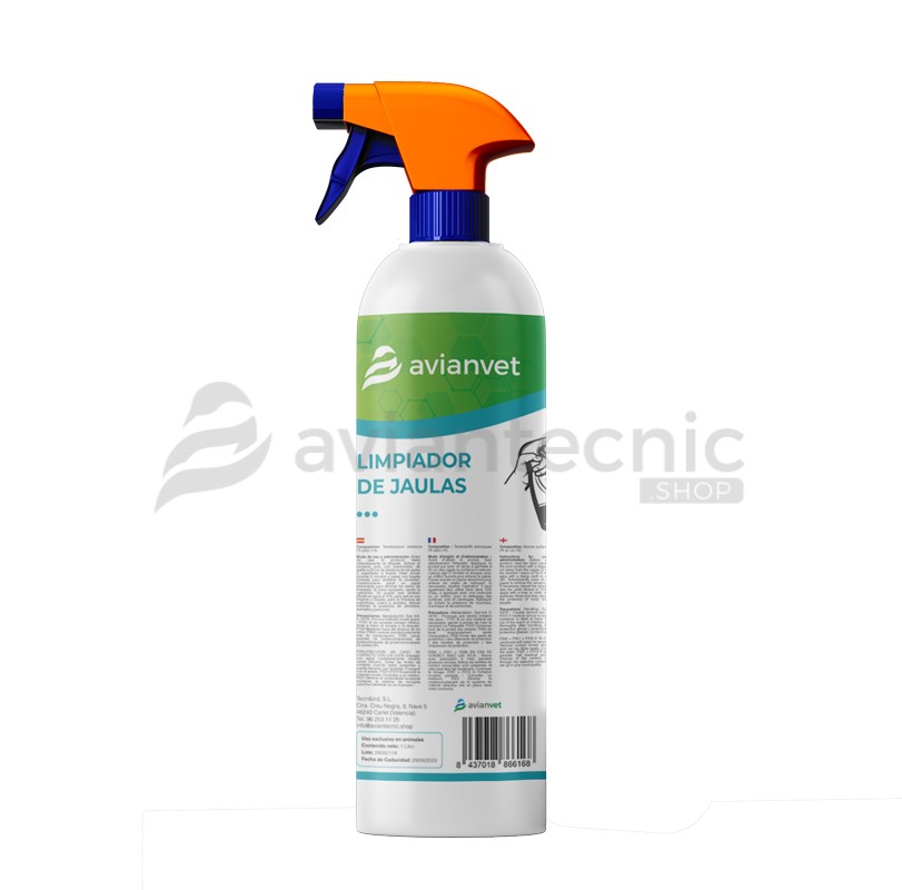 Modo de uso y administración: Antes de usar el producto léase detenidamente la etiqueta. Aplicar el producto puro con pulverizador de gatillo a 20 cm de distancia de las jaulas o superficies a limpiar. Dejar actuar durante 5 minutos y pasar una bayeta húmeda para arrastrar la suciedad. Posteriormente pasar un papel absorvente para eliminar los restos de limpiador. Si fuera necesario, repetir la operación. Se puede usar también diluido en agua al 10%, para aplicar con fregona o bayeta, para la limpieza de superficies, suelos y azulejos. Aplicar evitando la presencia de alimentos, animales y personas.
