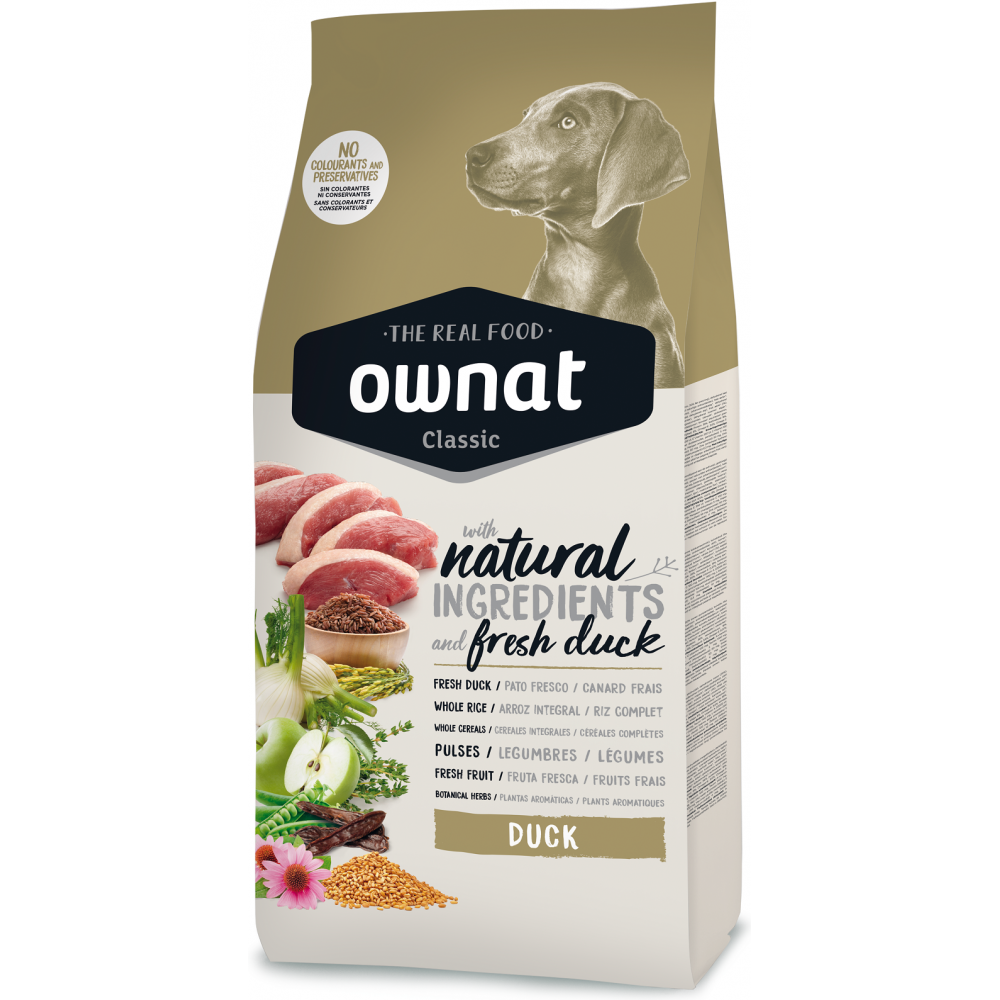 Pienso Ownat Classic Duck para perros adultos de todas las razas, elaborado con un 10% de pato fresco para una nutrición completa y equilibrada. Disponible en sacos de 4 kg y 12 kg.