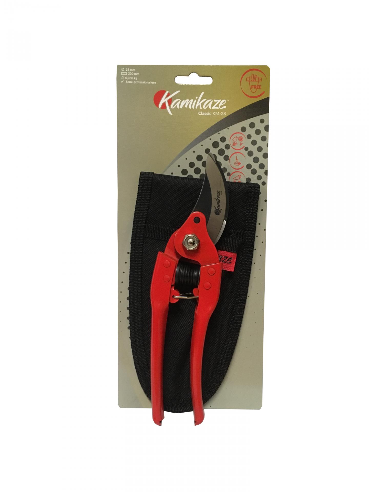 La tijera de poda KAMIKAZE Classic KM-28 es una herramienta robusta y eficiente, diseñada para ofrecer cortes precisos en tareas de jardinería y poda de una mano.