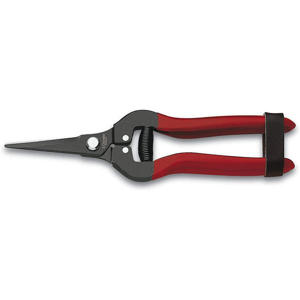 Tijera de vendimia recta de 190 mm, perfecta para la recolección precisa de uvas y frutas. Hoja afilada y mango ergonómico para un corte cómodo y eficiente.